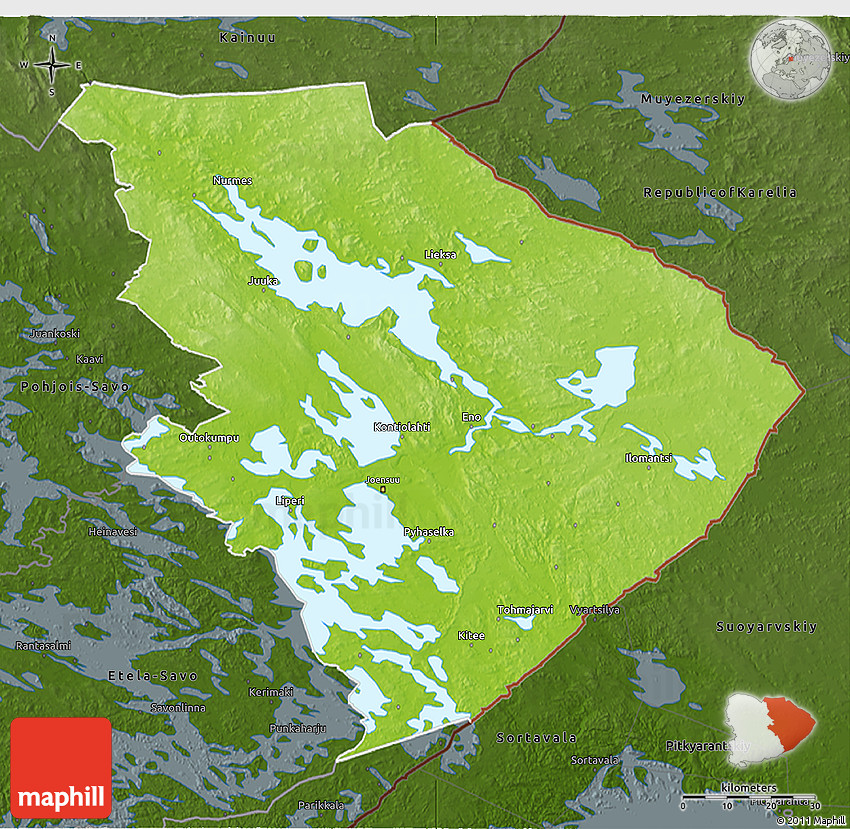 Physical map illustrates the mountains, lowlands, oceans, lakes and rivers and other physical landscape features of Pohjois-Karjala. Differences in land elevations relative to the sea level are represented by color.