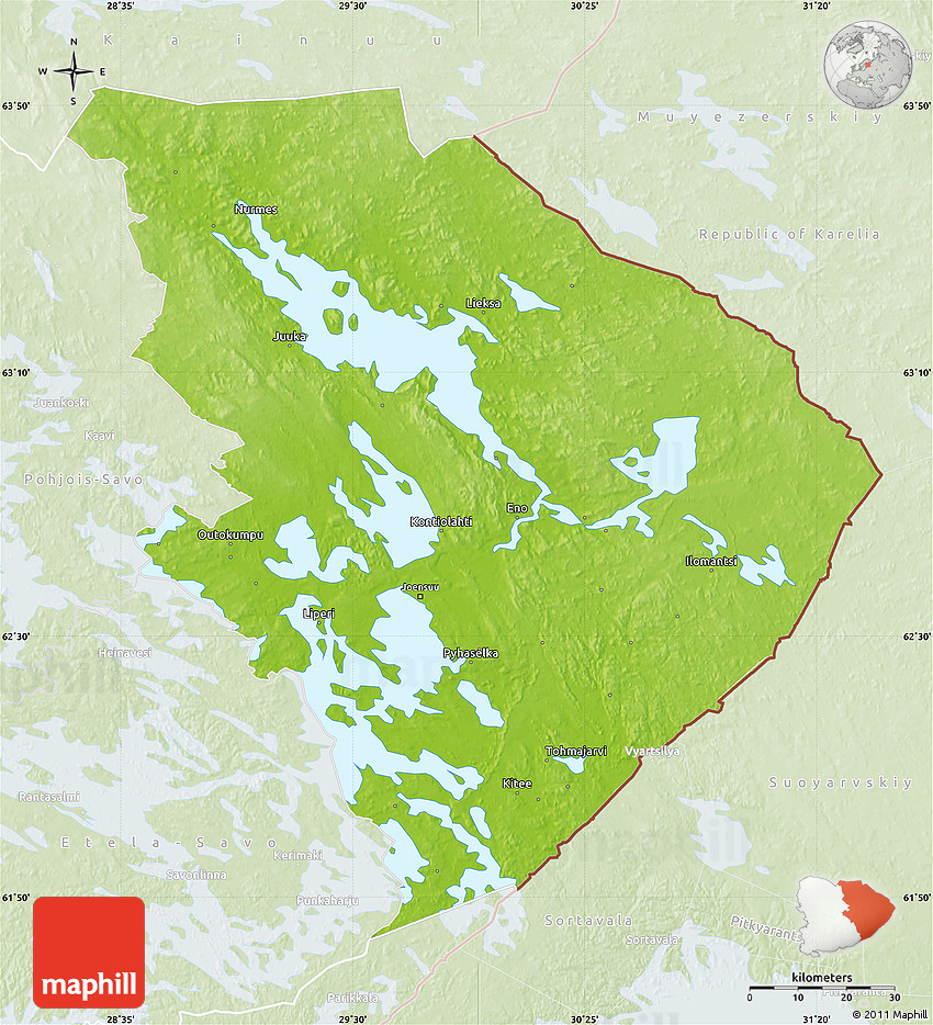 Physical map illustrates the mountains, lowlands, oceans, lakes and rivers and other physical landscape features of Pohjois-Karjala. Differences in land elevations relative to the sea level are represented by color.