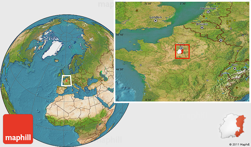 Maphill is a collection of map images. This image combines a satellite map with the globe centered on Evry. Use the buttons under the image to switch to different map types.