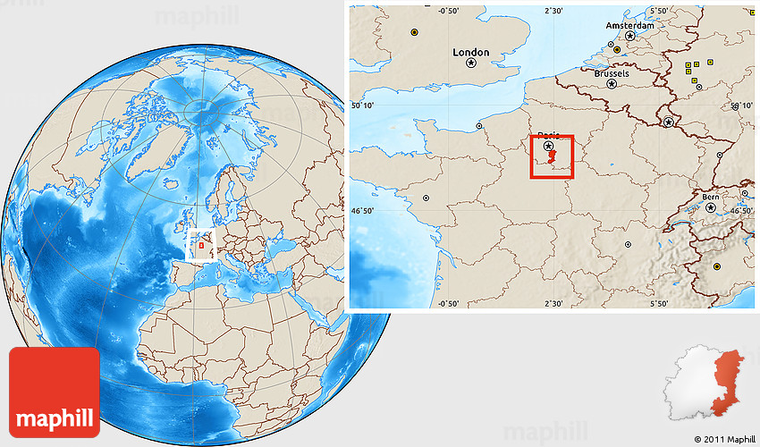Maphill is a collection of map images. This image combines a shaded relief map with the globe centered on Evry. Use the buttons under the image to switch to different map types.