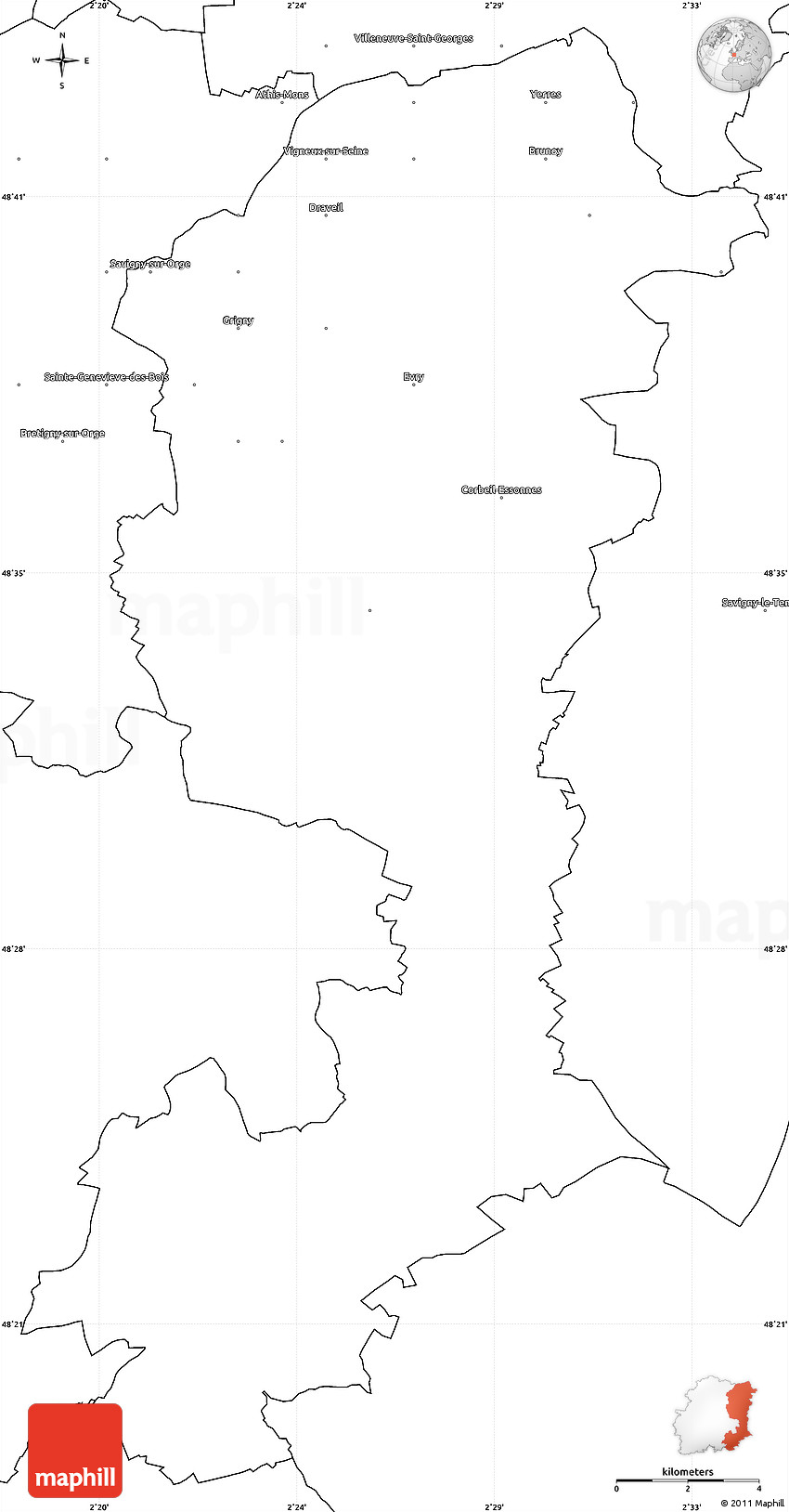 Outline maps, commonly known also as blank maps, indicate the overall shape of the country or region. Blank maps are often used for geography tests or other classroom or educational purposes. This blank map of Evry allows you to include whatever information you need to show.