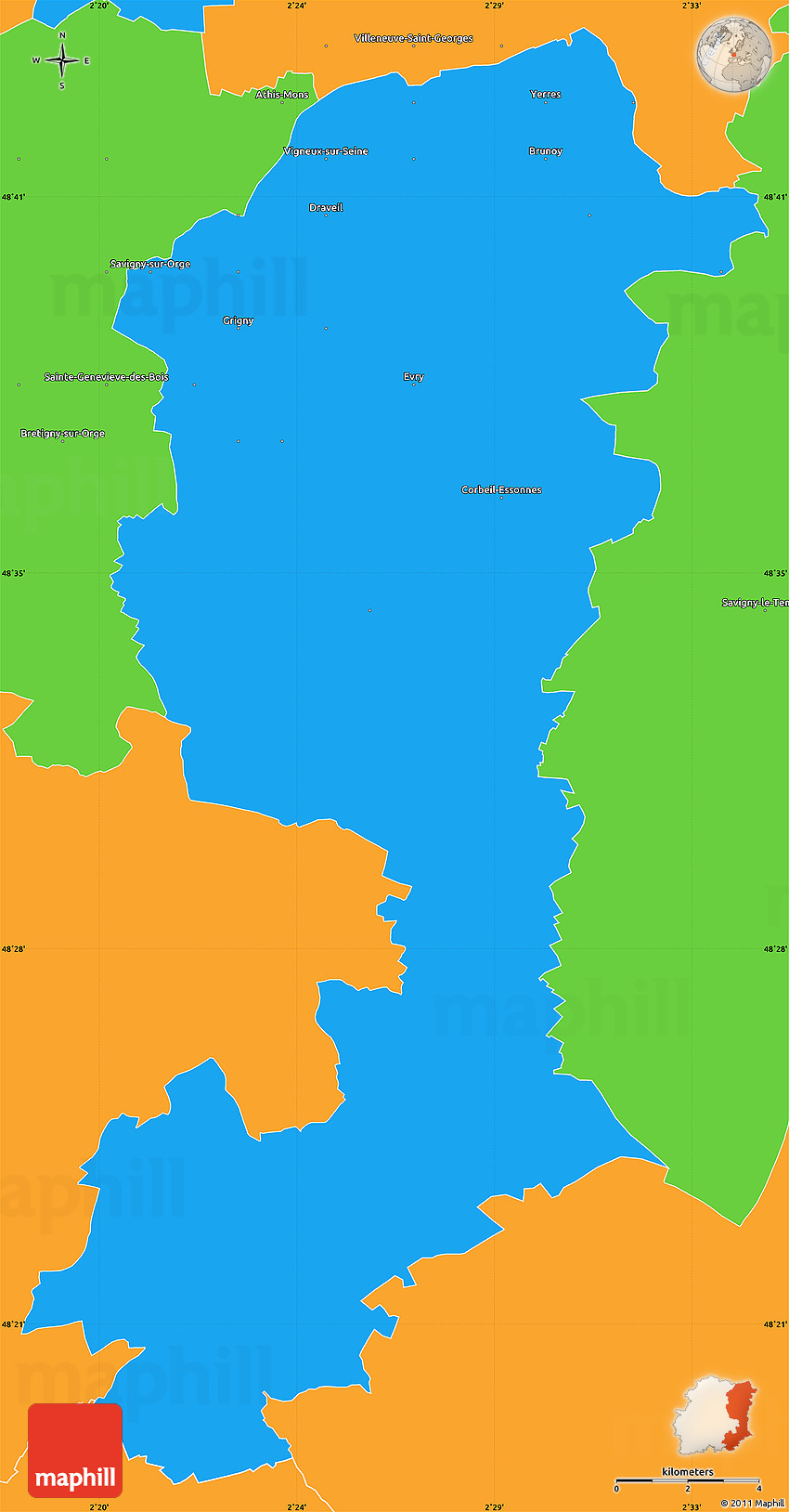 Each map type offers different information and each map style is designed for a different purpose. Read about the styles and map projection used in the above map (Political Simple Map of Evry).