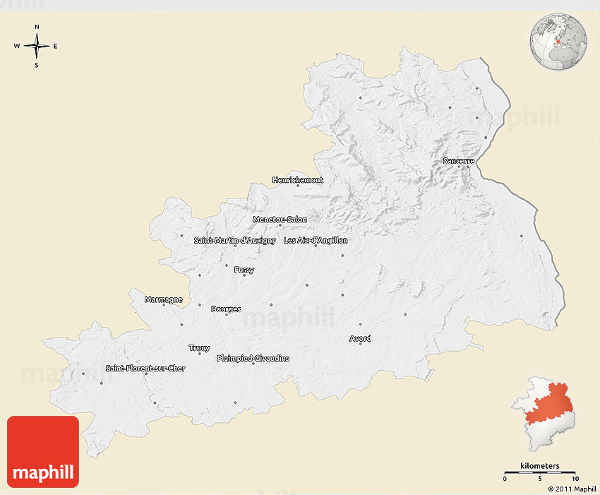This map uses colors of vintage antique maps. Bourges is highlighted with white. The rest of the map is beige colored shaded relief map.
