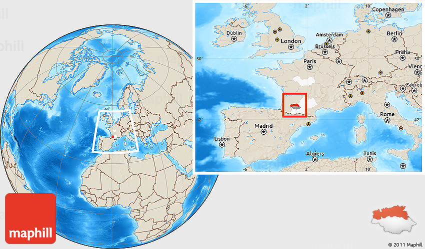 Maphill is a collection of map images. This image combines a shaded relief map with the globe centered on Condom. Use the buttons under the image to switch to different map types.