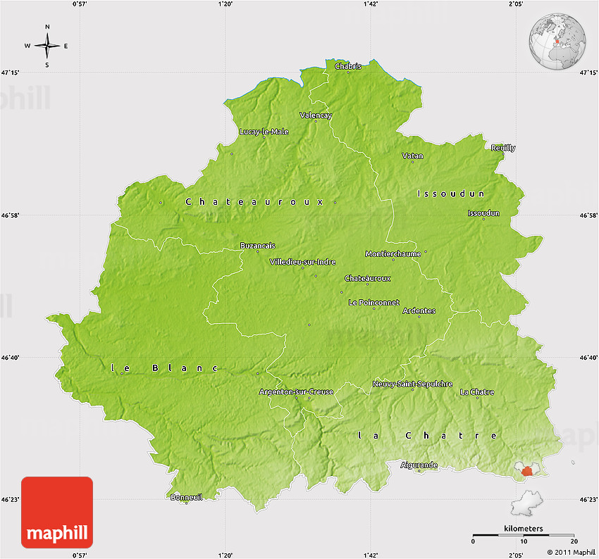 Each map type offers different information and each map style is designed for a different purpose. Read about the styles and map projection used in the above map (Physical Map of Indre, cropped outside).