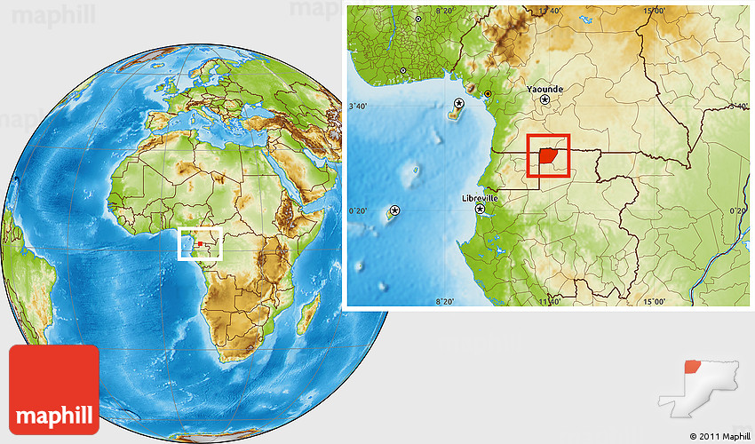 Maphill is a collection of map images. This image combines a physical map with the globe centered on Ntem (Bitam). Use the buttons under the image to switch to different map types.