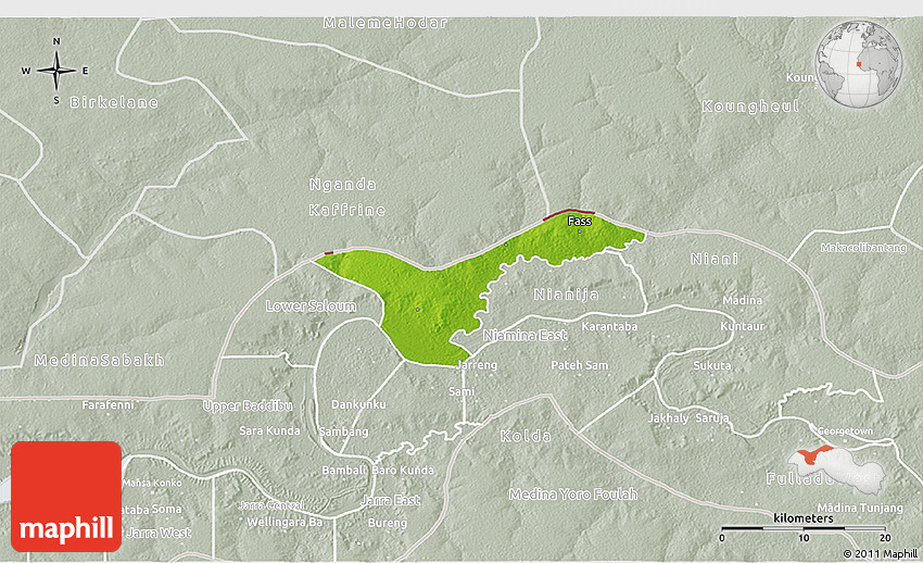 The 3D physical map represents one of several map types and styles available. Look at Upper Saloum, Maccarthy Island, The Gambia from different perspectives.