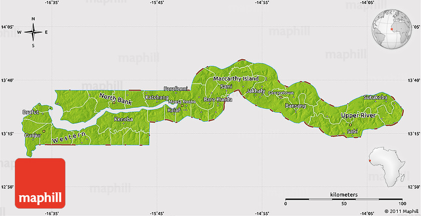 Maphill is a collection of map images. This physical map of The Gambia is one of them. Click on the Detailed button under the image to switch to a more detailed map.