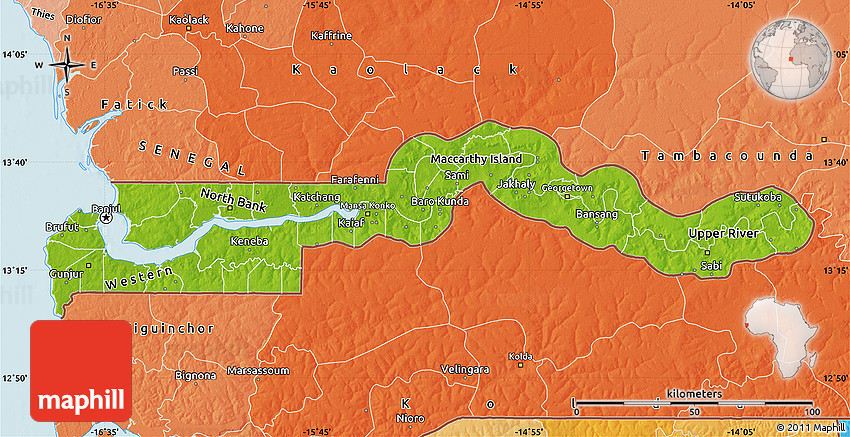 Physical map illustrates the mountains, lowlands, oceans, lakes and rivers and other physical landscape features of The Gambia. Differences in land elevations relative to the sea level are represented by color.