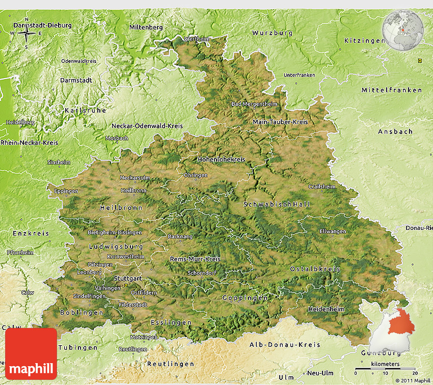 Physical map illustrates the mountains, lowlands, oceans, lakes and rivers and other physical landscape features of Stuttgart. Differences in land elevations relative to the sea level are represented by color.