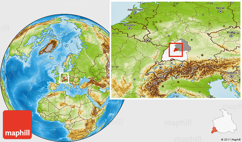 Maphill is a collection of map images. This image combines a physical map with the globe centered on Böblingen. Use the buttons under the image to switch to different map types.