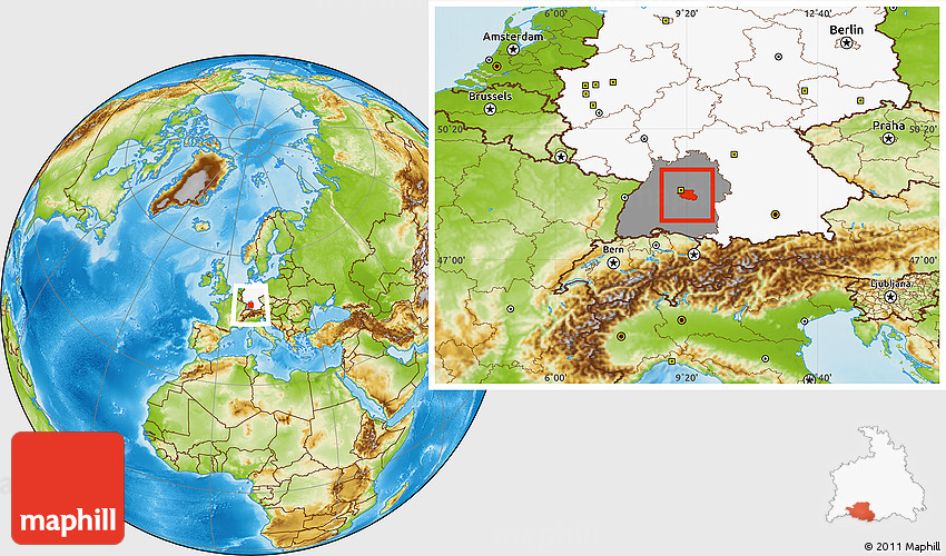 Maphill is a collection of map images. This image combines a physical map with the globe centered on Esslingen. Use the buttons under the image to switch to different map types.