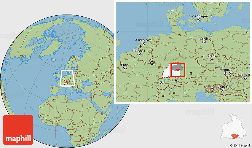 The location map of Göppingen combines two projections: the orthographic azimuthal projection for the globe and the simple geographic projection for the rectangular part of the map. Geographic projection has straight meridians and parallels, each degree of latitude and longitude is the same size over the entire world map.
