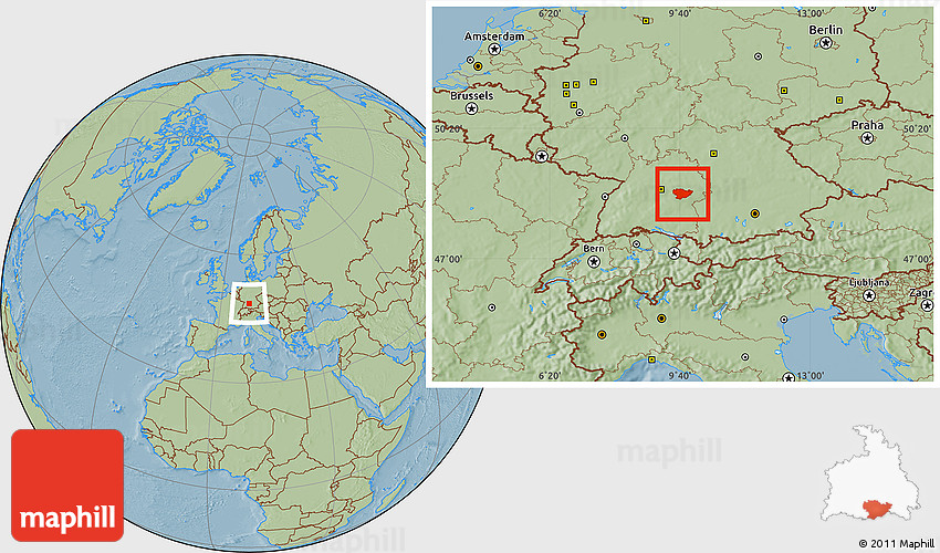 The location map of Göppingen combines two projections: the orthographic azimuthal projection for the globe and the simple geographic projection for the rectangular part of the map. Geographic projection has straight meridians and parallels, each degree of latitude and longitude is the same size over the entire world map.