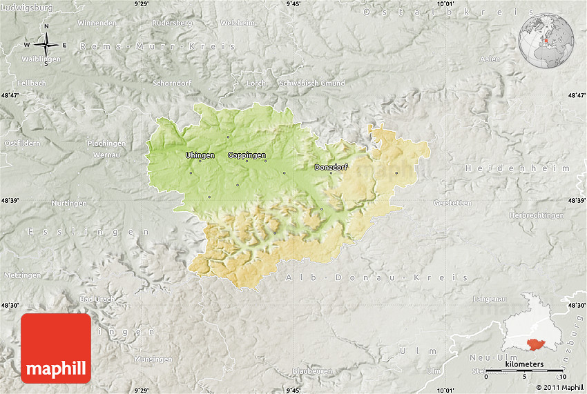 Each map type offers different information and each map style is designed for a different purpose. Read about the styles and map projection used in the above map (Physical Map of Göppingen, lighten, semi-desaturated).