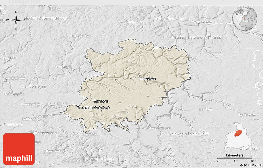 The value of Maphill lies in the possibility to look at the same area from several perspectives. Maphill presents the map of Hohenlohekreis in a wide variety of map types and styles.