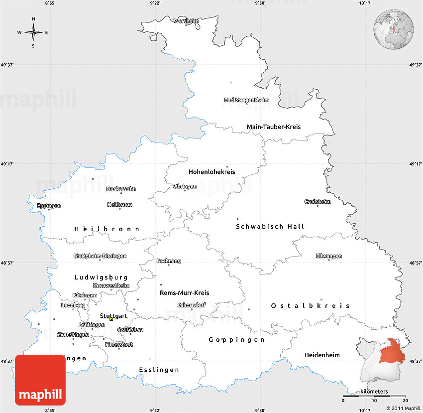 The simple silver style outline map represents one of several map types and styles available. Look at Stuttgart, Baden-Württemberg, Germany from different perspectives.