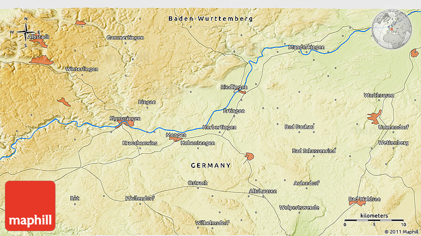 The 3D physical map represents one of many map types and styles available. Look at Blönried, Ravensburg, Tübingen, Baden-Württemberg, Germany from different perspectives.
