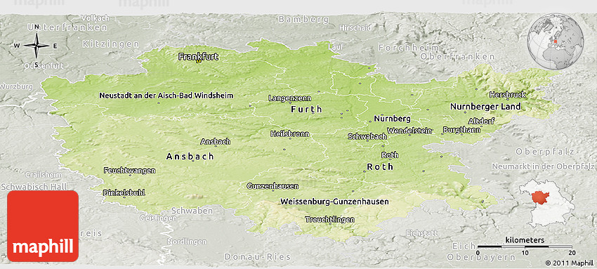 The panoramic physical map represents one of several map types and styles available. Look at Mittelfranken, Bayern, Germany from different perspectives.
