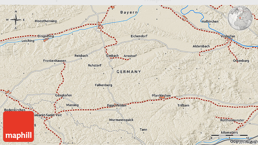 The 3D shaded relief map represents one of many map types and styles available. Look at Paßhausen, Dingolfing-Landau, Niederbayern, Bayern, Germany from different perspectives.