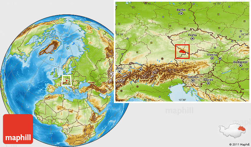 Maphill is a collection of map images. This image combines a physical map with the globe centered on Freyung-Grafenau. Use the buttons under the image to switch to different map types.