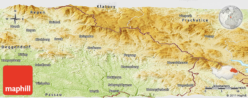 The panoramic physical map represents one of several map types available. Look at Freyung-Grafenau, Niederbayern, Bayern, Germany from different perspectives.