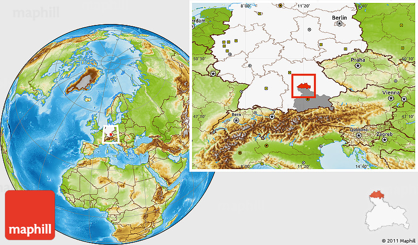 Maphill is a collection of map images. This image combines a physical map with the globe centered on Eichstätt. Use the buttons under the image to switch to different map types.