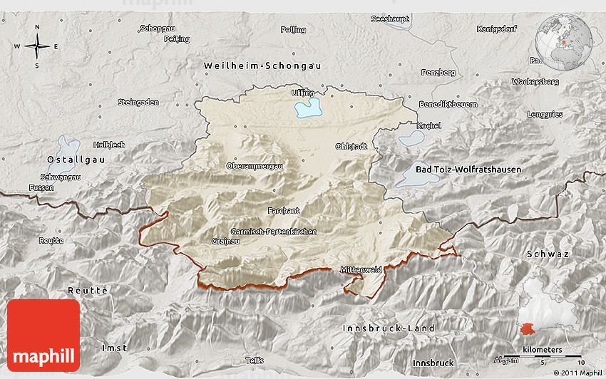 Shaded relief map shows landscape features, such as mountains, valleys and plateaus. Flat areas are smooth on the map, areas with steep slopes and mountains appear more rough. The above map of Garmisch-Partenkirchen was created using a digital elevation model.