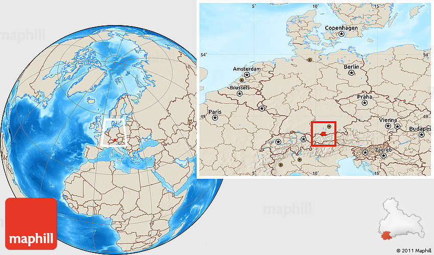 Maphill is a collection of map images. This image combines a shaded relief map with the globe centered on Garmisch-Partenkirchen. Use the buttons under the image to switch to different map types.