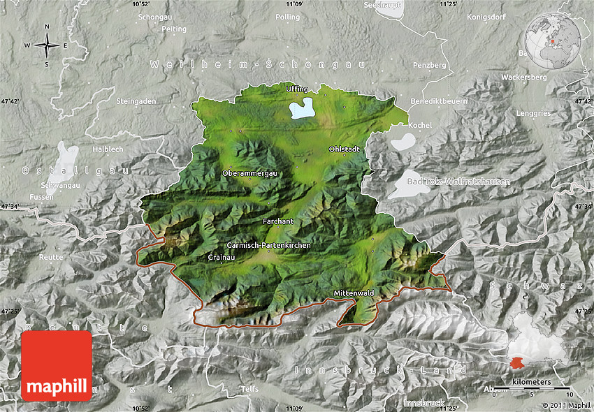 The flat satellite map represents one of several map types available. Look at Garmisch-Partenkirchen, Oberbayern, Bayern, Germany from different perspectives.