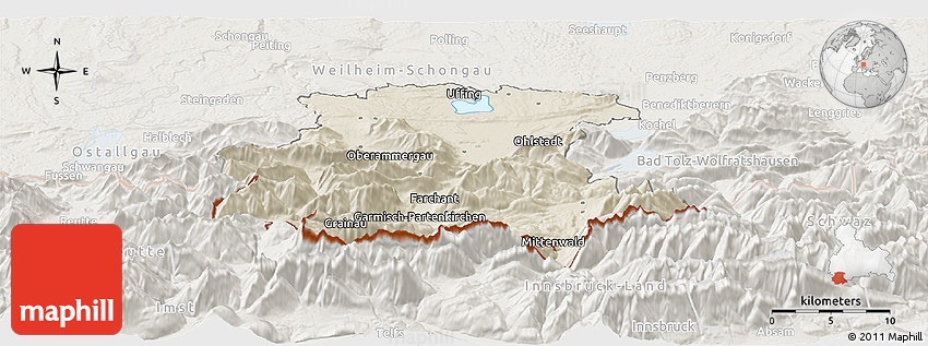 The panoramic shaded relief map represents one of several map types available. Look at Garmisch-Partenkirchen, Oberbayern, Bayern, Germany from different perspectives.
