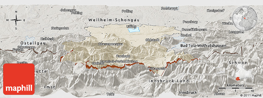 The panoramic shaded relief map represents one of several map types available. Look at Garmisch-Partenkirchen, Oberbayern, Bayern, Germany from different perspectives.