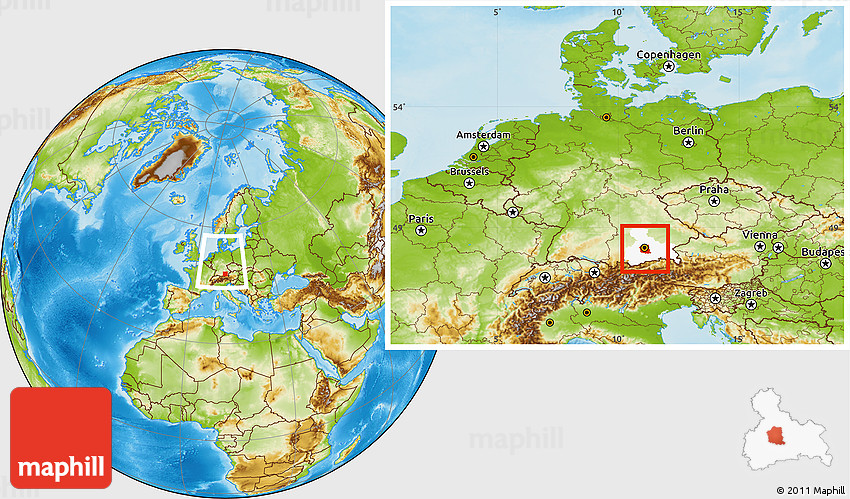 Maphill is a collection of map images. This image combines a physical map with the globe centered on München. Use the buttons under the image to switch to different map types.
