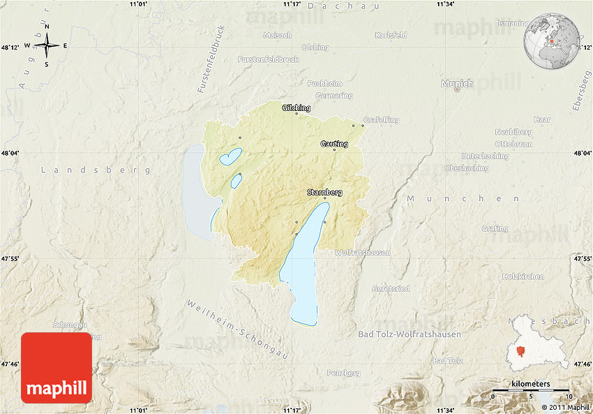 Each map type offers different information and each map style is designed for a different purpose. Read about the styles and map projection used in the above map (Physical Map of Starnberg, lighten).