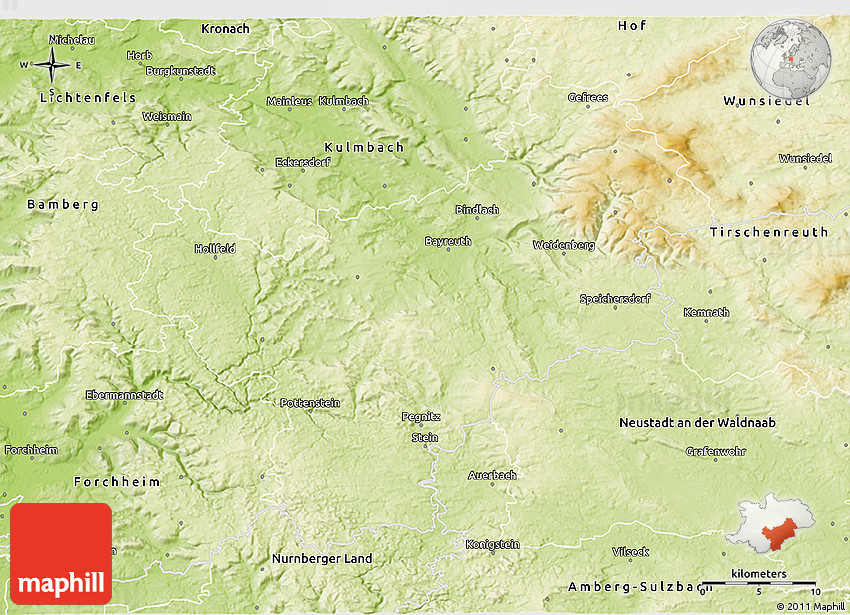 Physical map illustrates the mountains, lowlands, oceans, lakes and rivers and other physical landscape features of Bayreuth. Differences in land elevations relative to the sea level are represented by color.
