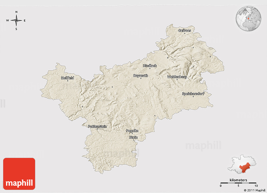 Each map type offers different information and each map style is designed for a different purpose. Read about the styles and map projection used in the above map (Shaded Relief 3D Map of Bayreuth, single color outside).