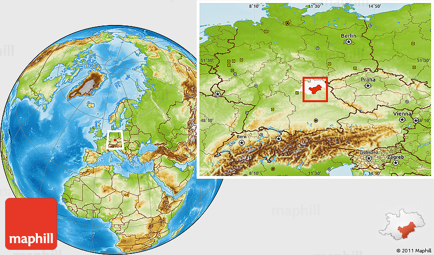 Maphill is a collection of map images. This image combines a physical map with the globe centered on Bayreuth. Use the buttons under the image to switch to different map types.