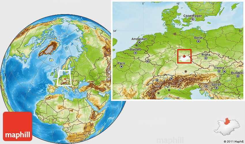 Maphill is a collection of map images. This image combines a physical map with the globe centered on Kronach. Use the buttons under the image to switch to different map types.