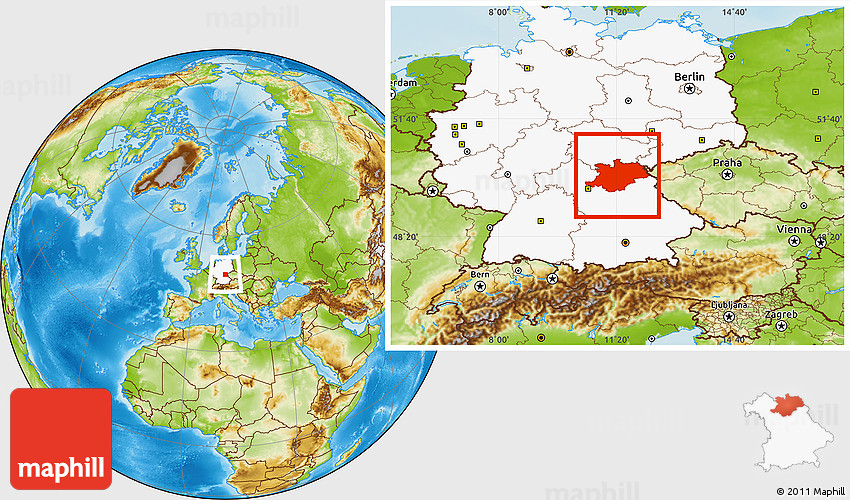 Maphill is a collection of map images. This image combines a physical map with the globe centered on Oberfranken. Use the buttons under the image to switch to different map types.