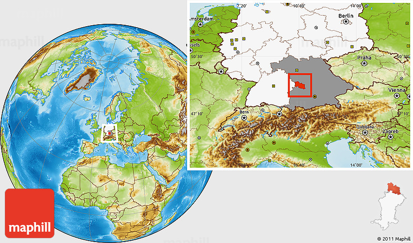 Maphill is a collection of map images. This image combines a physical map with the globe centered on Donau-Ries. Use the buttons under the image to switch to different map types.