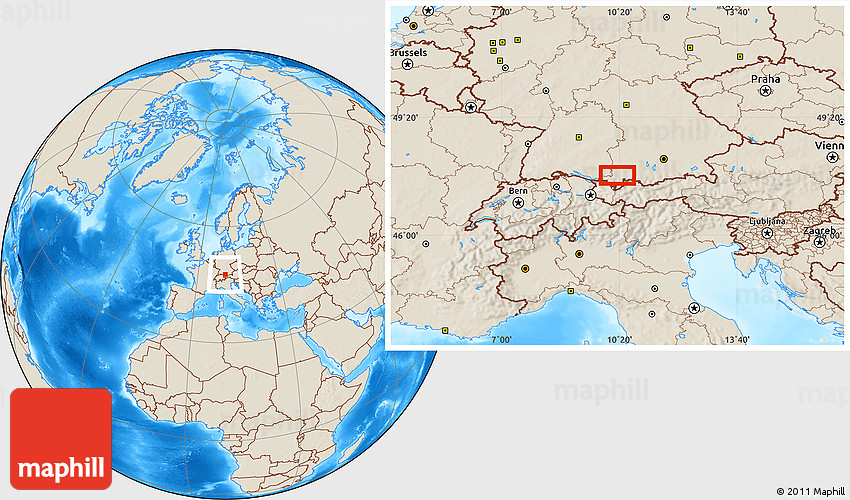 Maphill is a collection of map images. This image combines a shaded relief map with the globe centered on Unterthalhofen. Use the buttons under the image to switch to different map types.