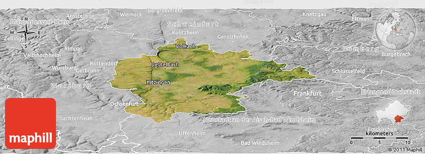 This satellite panoramic map of Kitzingen is available in a JPEG image format. You can embed, print or download the map just like any other image. Enrich your website with hiqh quality map graphics. Use the Free map button above the image.