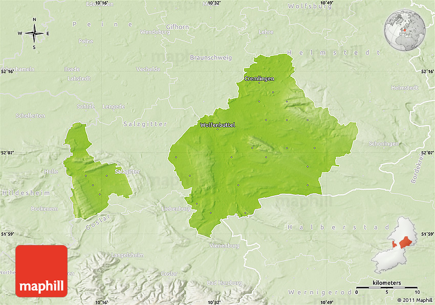 Each map type offers different information and each map style is designed for a different purpose. Read about the styles and map projection used in the above map (Physical Map of Wolfenbüttel, lighten).