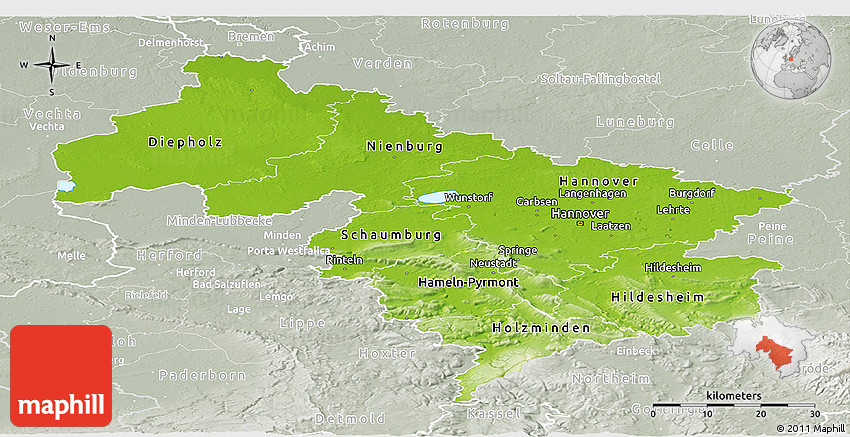 Physical map illustrates the mountains, lowlands, oceans, lakes and rivers and other physical landscape features of Hannover. Differences in land elevations relative to the sea level are represented by color.