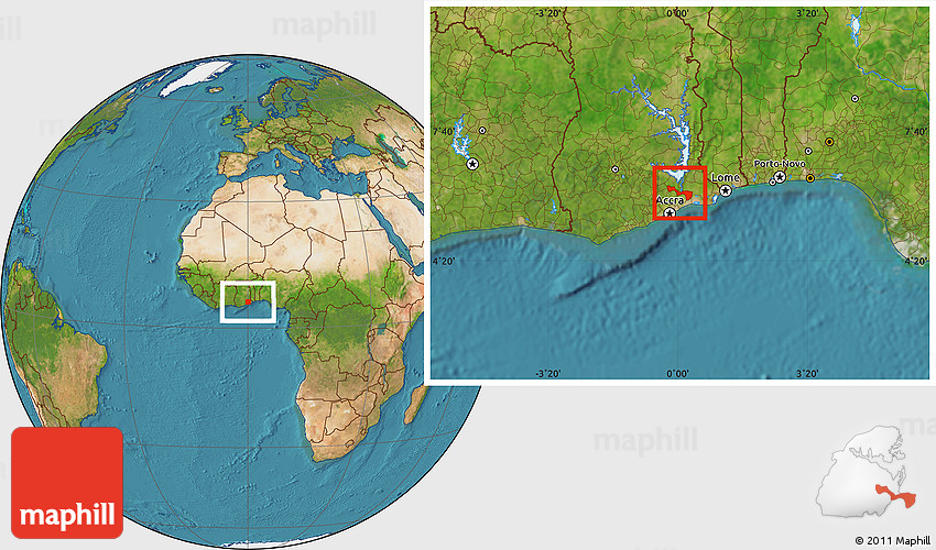 Maphill is a collection of map images. This image combines a satellite map with the globe centered on Yilo-Krobo-Osudoku. Use the buttons under the image to switch to different map types.