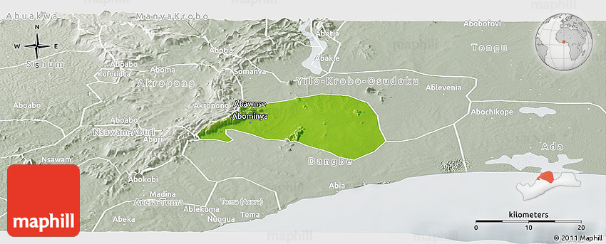 The panoramic physical map represents one of several map types and styles available. Look at Shai, Greater Accra, Ghana from different perspectives.