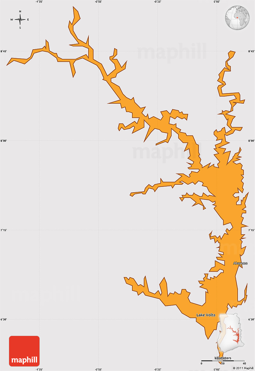 Maphill is a collection of map graphics. This simple outline map of Lake Volta is one of these images. Use the buttons under the image to switch to more comprehensive and detailed map types.