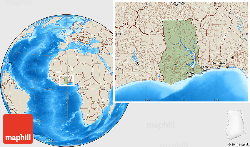 Maphill is a collection of map images. This image combines a savanna style map with the globe centered on Ghana. Use the buttons under the image to switch to different map types.