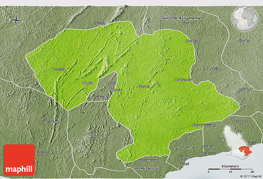 Physical map illustrates the mountains, lowlands, oceans, lakes and rivers and other physical landscape features of Prestea. Differences in land elevations relative to the sea level are represented by color.