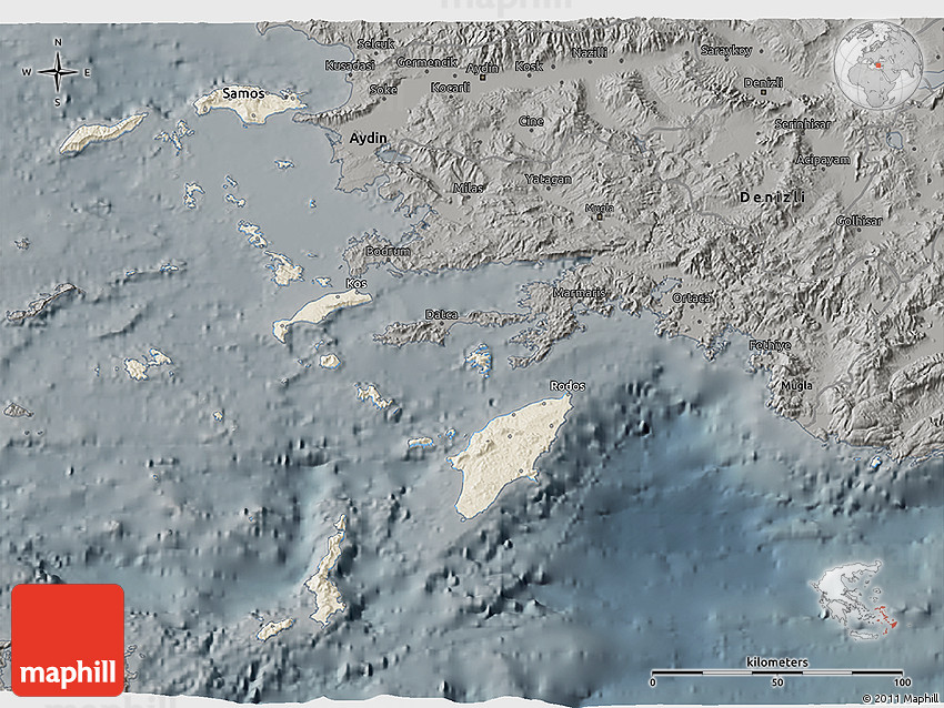 Shaded relief map shows landscape features, such as mountains, valleys and plateaus. Flat areas are smooth on the map, areas with steep slopes and mountains appear more rough. The above map of Dodekanissa was created using a digital elevation model.